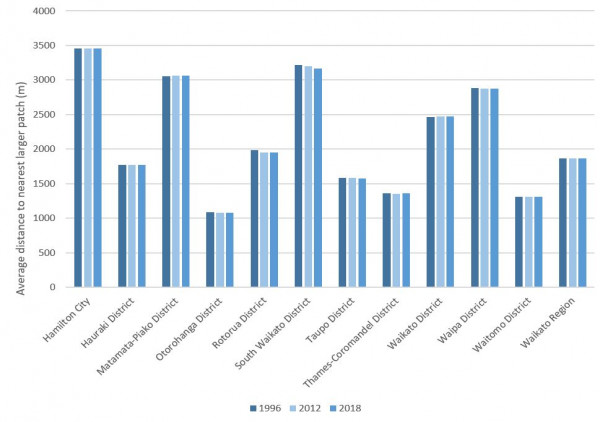 This indicator measures indigenous forest fragmentation within the Waikato region. However, some patches of indigenous forest span our region's boundary. To provide statistics that reflect the extent of native forest in the region, such polygons have been cut along the regional boundary, meaning we are not reporting their true size , or connectivity (for instance, their nearest neighbour may be in an adjacent region). Three districts are not fully within the Waikato region. Data for parts of the Waitomo, Rotorua and Taupō districts located in our region may not be representative of the whole district.
