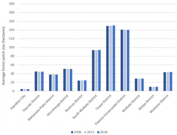 Waikato Regional Council measures forest fragmentation using spatial layers from the Land Cover Database. The LCDB Version 5.0 (which includes attributes for vegetation class names at each of the five time periods) was processed to measure the parameters of indigenous forest patches greater than 0.4ha, both within the Waikato region and by district council area (2019 territorial boundary layer).