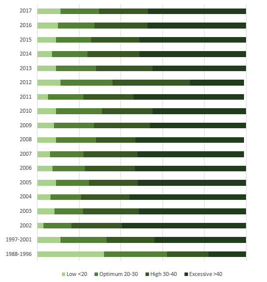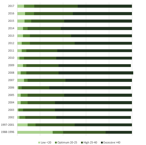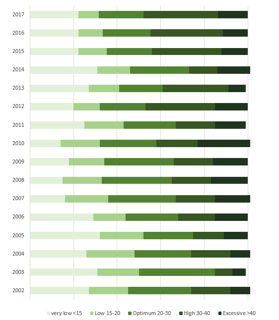 Sheep and beef farms with excessive Olsen P levels have fluctuated between 6-26% on sheep and beef farms. About 8-14 percent of soil samples had excess phosphorus fertility in 2013, compared to 15-25 percent in 2010. Olsen P data in 2013 was similar to the data from 2002 (about 9-18 percent). In 2017, 14-16 percent of sheep and beef farms had excessive Olsen P.