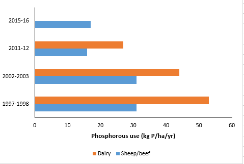 Yearly phosphorus run-off is similar for dairy and sheep and beef farms, fluctuating between 0.9 and 2.4 kilograms of phosphorus per hectare. The value for sheep and beef reflects the hilly nature of these farms; the steeper the slope, the more phosphorous is likely to run off. In comparison, dairy farms have higher Olsen P levels than sheep and beef farms. More P in the soil means more P in the runoff.