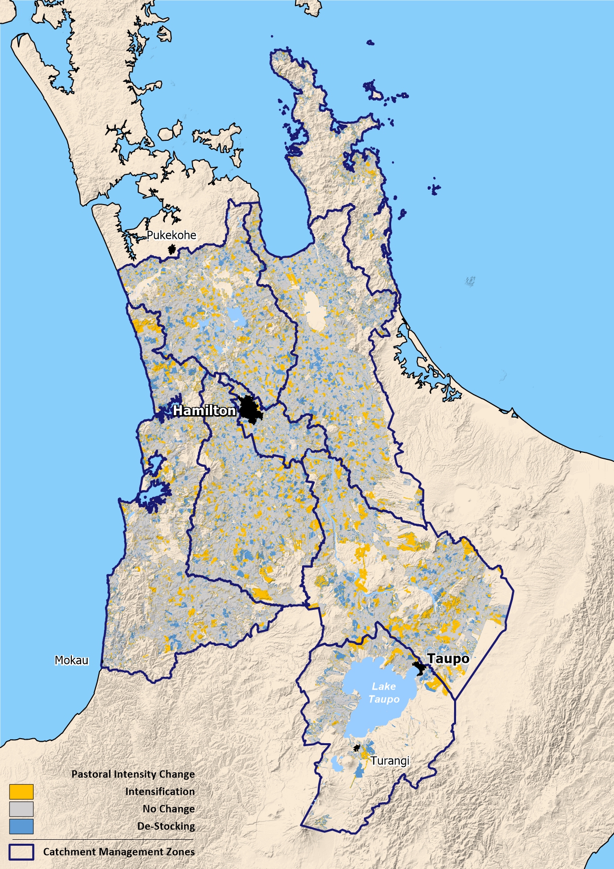 Waikato Regional Council calculates changes in pastoral intensification in the eight major catchment management zones in the Waikato region.