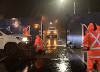 Council staff close the Criterion Bridge floodgates in Paeroa during Cyclone Hale.